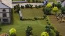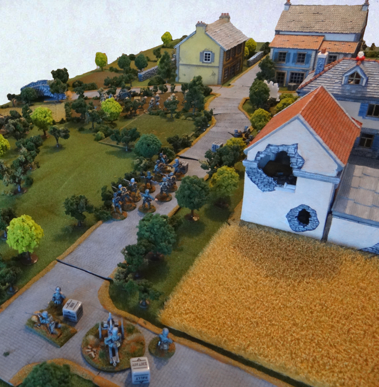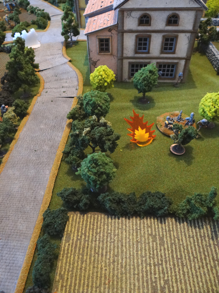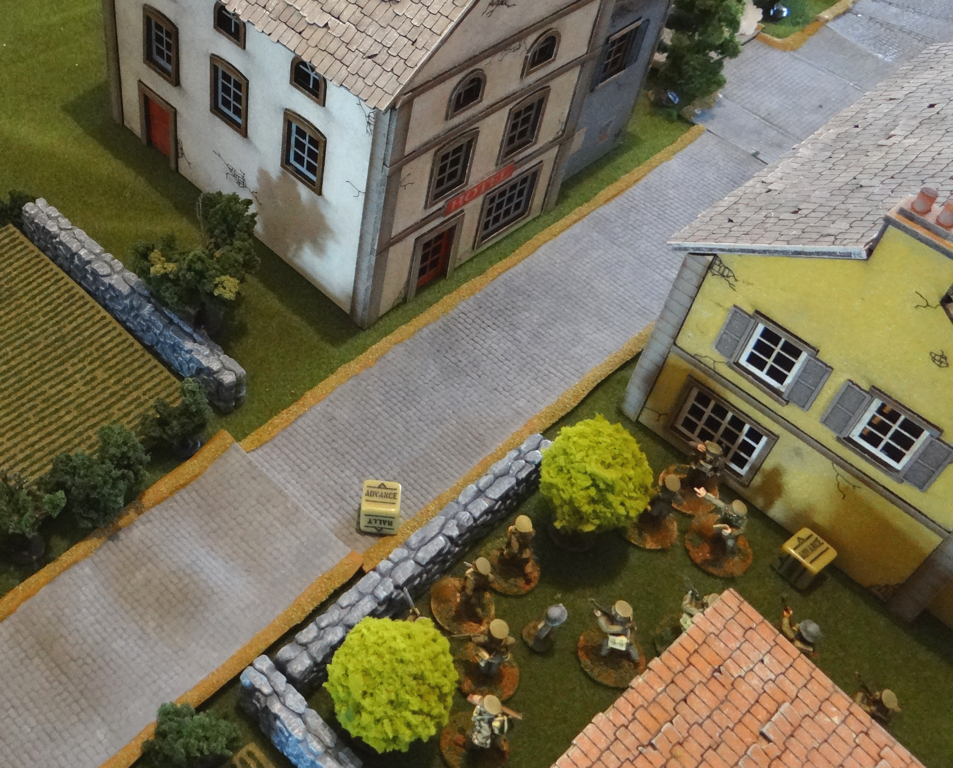 The Granatwerfer team tried again. The team was under pressure though. The lanyard was jerked too hard or the base plate had shifted. One of the two; it was hard to tell with the incoming fire. The spigot-mounted fragmentation bomb landed further from the target this time. There wouldn’t be another opportunity. The last British section arrived on-table, following on from the armoured car. The British infantry advanced with guns at the port. The NCO spotted the Granatwerfer team. The men took aim. The beaten zone of .303 bullets landed all around the Granatwerfer, killing one of the crew. The pressure was beginning to tell on the German right flank.