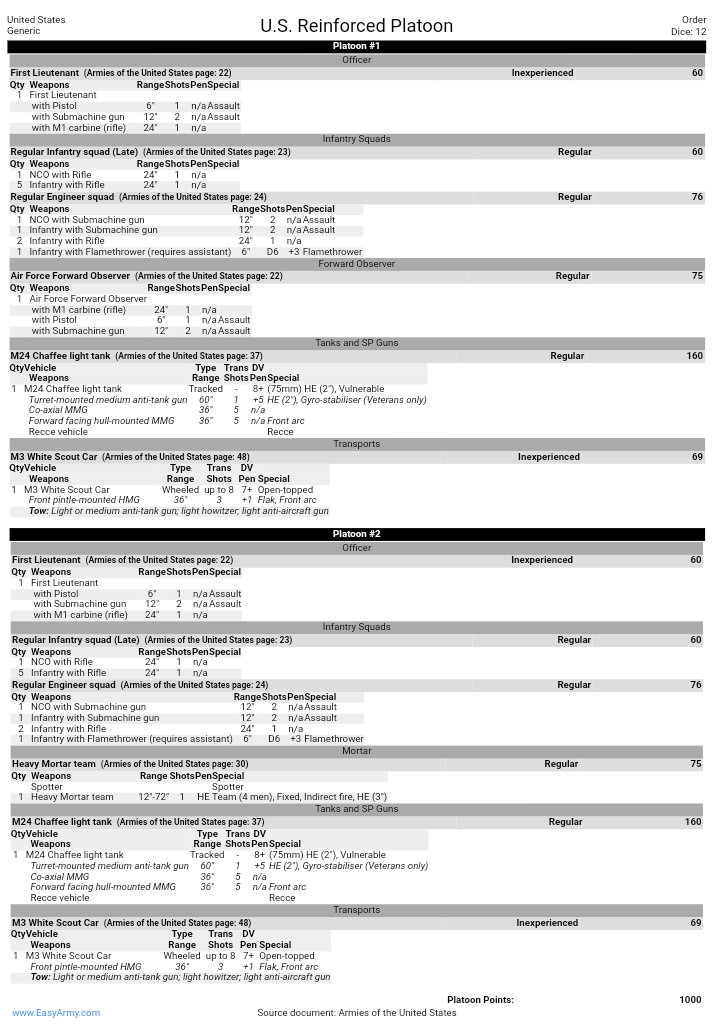 ParticipantWhat do you include in your favourite 1000 point force? My attached 1000 point US force consists of 2 platoons, each with 1 inexperienced first lieutenant, 1 regular 6-man squad, 1 regular engineer team, 1 regular Chaffee and 1 inexperienced M3 White Scout Car. The only difference is Platoon 1 has a regular Forward Air Observer while Platoon 2 has a regular heavy mortar.