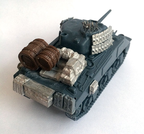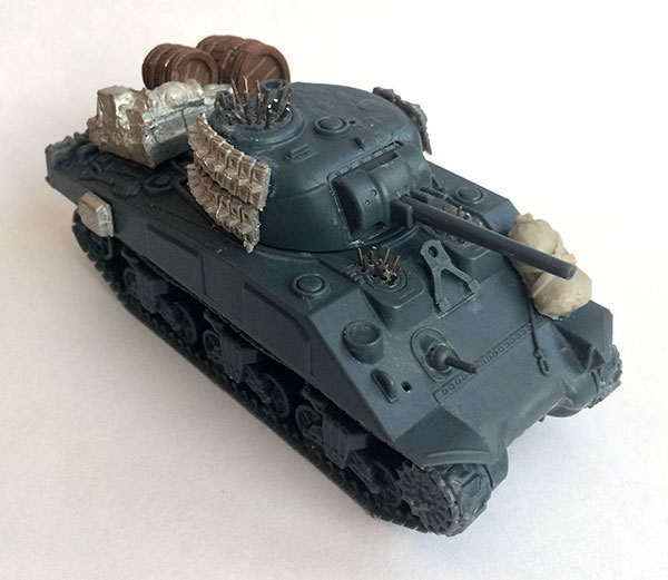 Externally, the Zippo looks almost identical to a standard M4A3… so – to make mine visually different on the battlefield, I’ve added a fuel trailer and the nozzle from the Churchill Crocodile kit… and – by using a magnet to attach the trailer, it can be disconnected or pivoted…