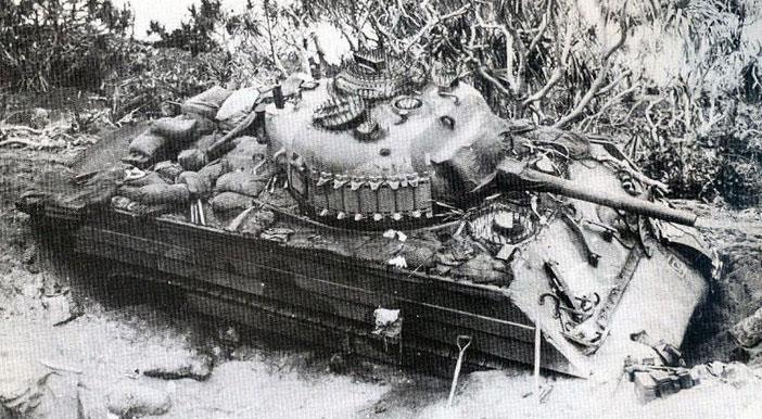 Specifically for the Pacific, the addition of track sections to the turret and sides of the vehicle was used to combat the deadly Japanese 47mm high velocity anti-tank gun – which became a real danger to US Armoured formations – for example, the 193rd Tank Battalion were held at bay by a single gun which knocked out 4 battalions in a single day!