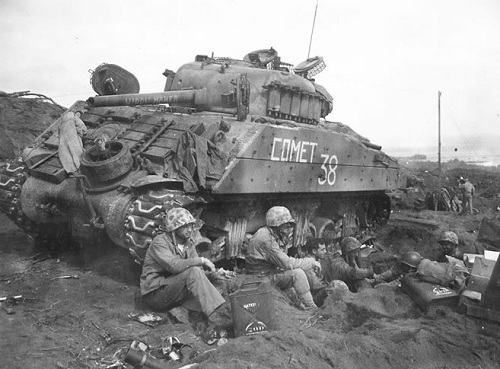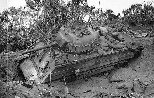 When the Marines landed in the Pacific, they quickly realised that the Japanese armour which they came up-against was no match for their Stuarts and Shermans. However – the Japanese 47mm Anti-tank Gun was perfectly capable of knocking out Shermans, and could easily be concealed. The Japanese also had a number of less conventional anti-tank tactics which took the Americans by surprise.