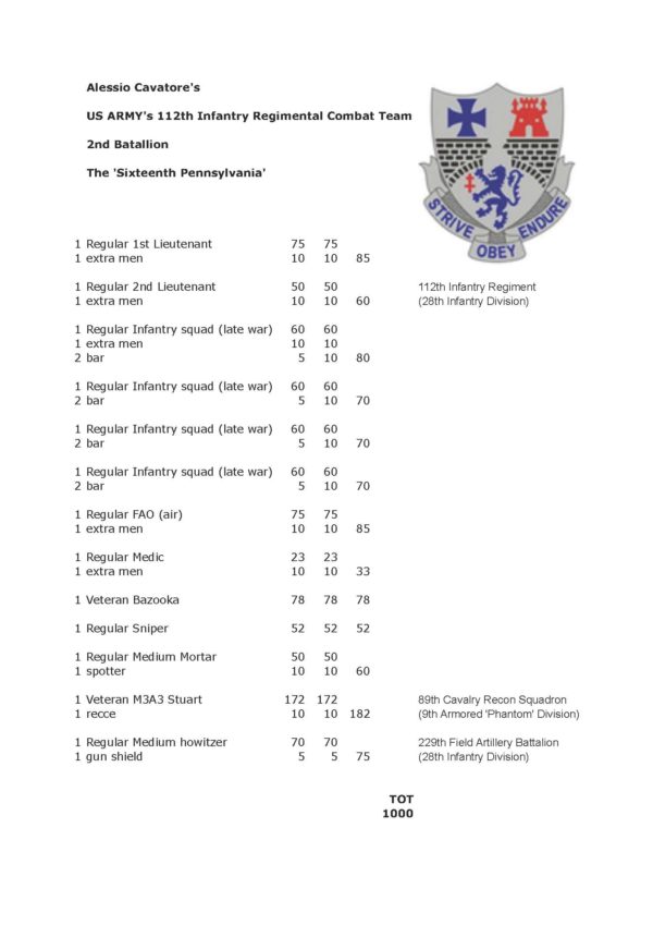I then did a little bit of research to give a nice theme to my ‘regular GIs’ force, and what I read about the regular army units at the Battle of the Bulge made me choose the 2nd Batallion of the 112th Infantry Regimental Combat Team (The ‘Sixteenth Pennsylvania’). I have to admit that the choice was influenced by the regimental motto and badge, which I thought were very inspiring – see below! The only unit that needed to be from a different formation was the Stuart, and I thought it both reasonable and cool that it might have belonged to the 9th Armored ‘Phantom’ Division, which was operating nearby at the time. Here’s the final force list I took to the tournament: