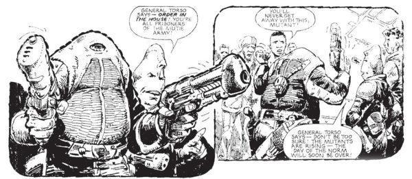 Each division of the Mutant Army was led by a fierce, charismatic figure: Studs Boyce of the Midlands Divison, the Welsh Divisions Evans the Fist, Clacton Fuzz of the South-East Division and the Tyne-and-Weirdies led by The Torso from Newcastle. Middenface McNulty commanded the Scottish Division, leading his kilted muties from hell!