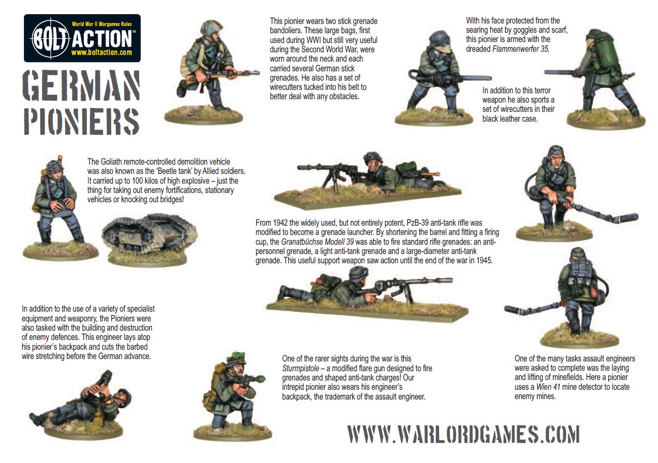 German Assault Pioneers were skilled at building all manner of fortifications, communications lines, tank traps and minefields. In addition to building useful structures, they were adept at the destruction of similar enemy positions, blowing railway lines and making roads unsafe for the enemy to travel along. As the German quest for global superiority stalled and finally crashed down around them, the Pioniers were tasked with the vital job of slowing the Allied advance, be it by booby trap, minefield, blown bridges, or taking the fight directly to the enemy.