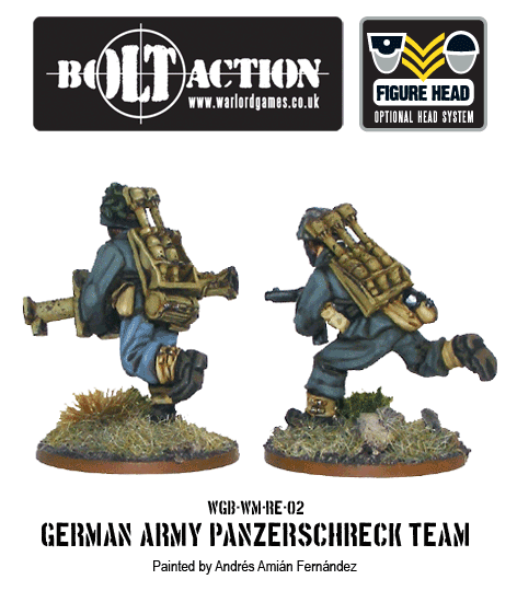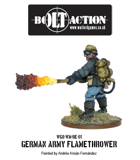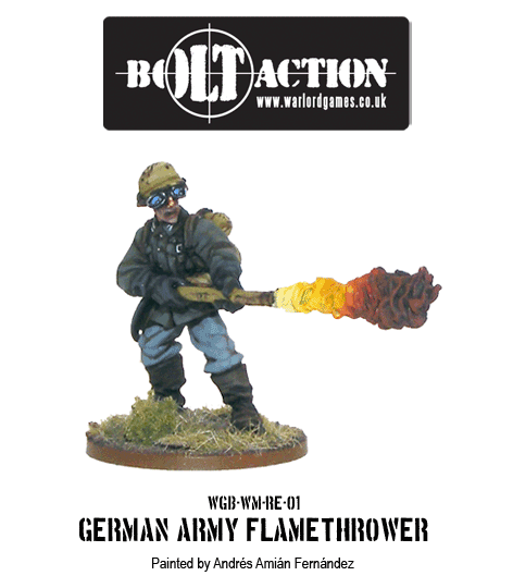 First up is the new Bolt Action German army specialists pack. Containing a two man Panzerschreck team running hell for leather to get to cover or perhaps to get onto the weaker flank of the Allied armour this a very dynamic pairing. Also included in the pack is a soldat blazing away with his Flammenwerfer 41 flamethrower. The Panzerschreck team makes the most of the Warlord Figure Head (TM) system of separate heads allowing you to build the models with which ever head variant you desire. We love the brushwork Andrés has used on the faces as well as the flames!