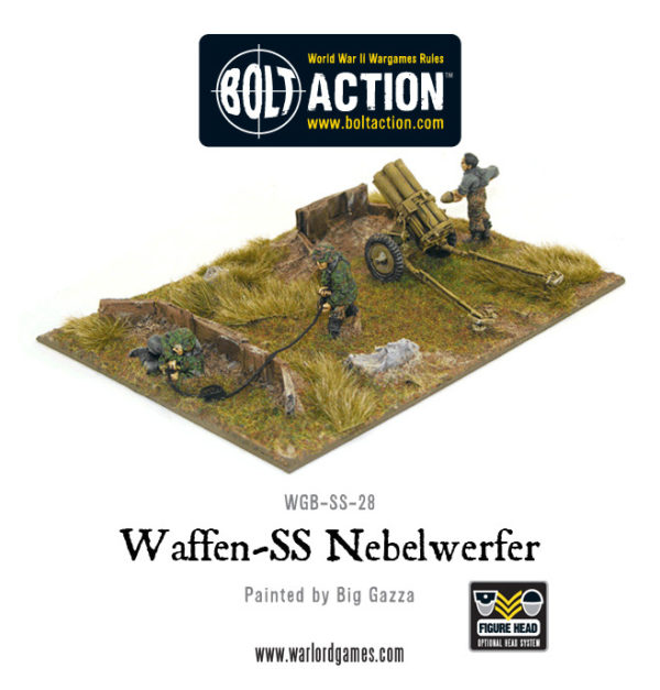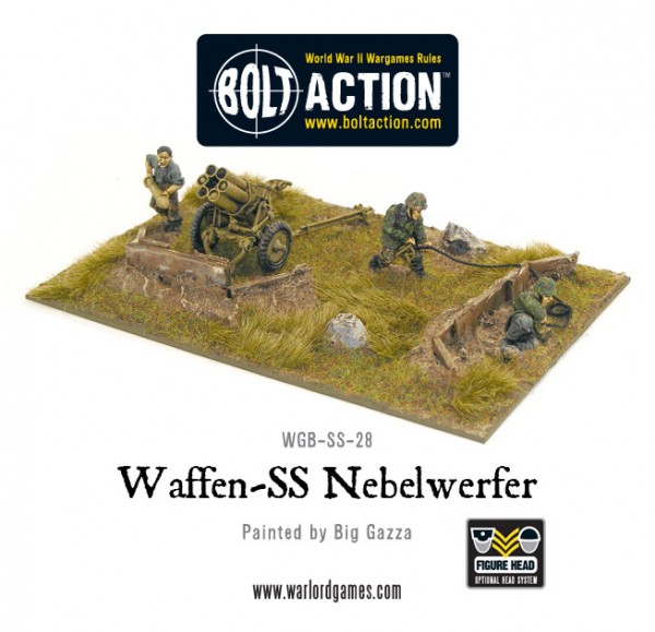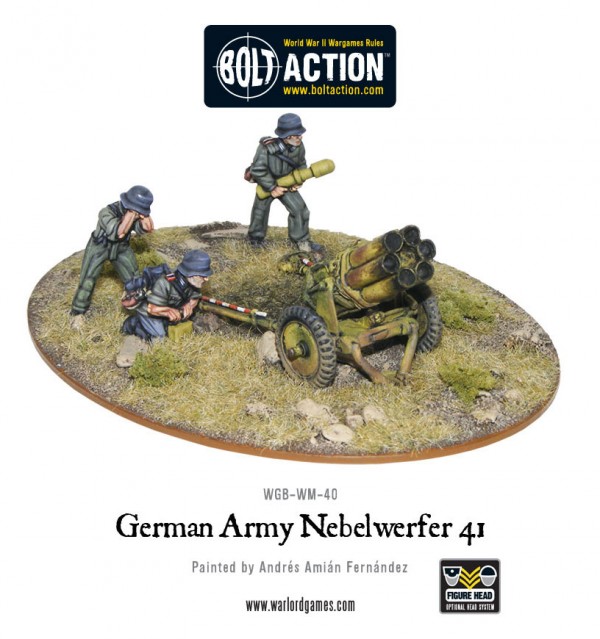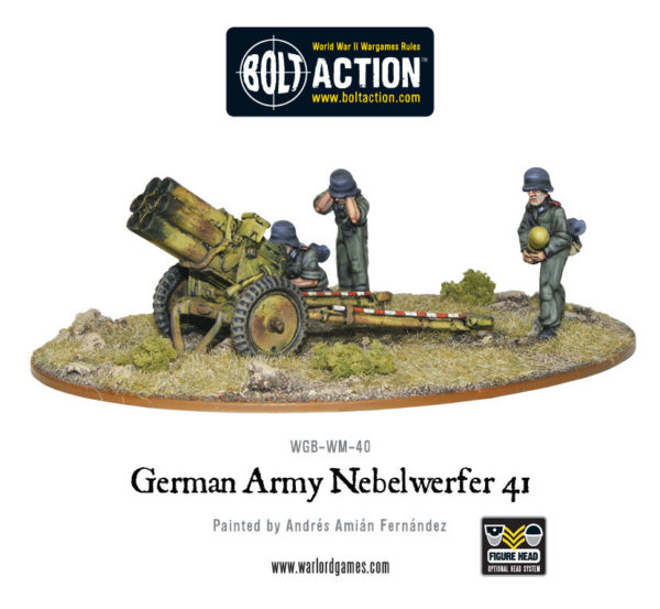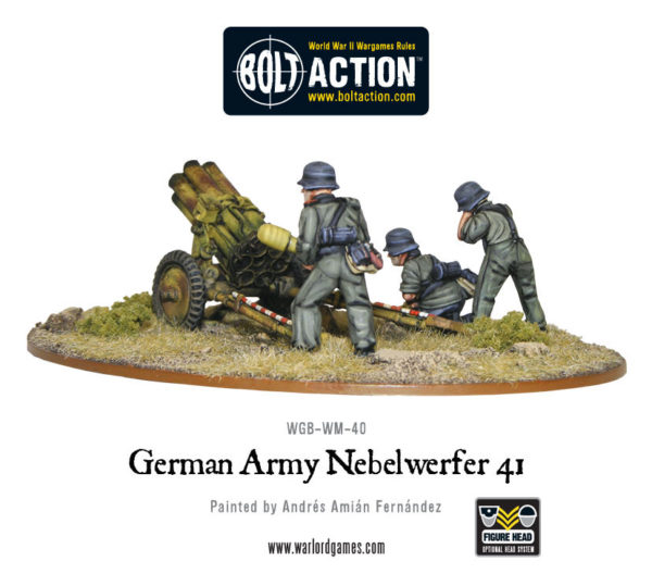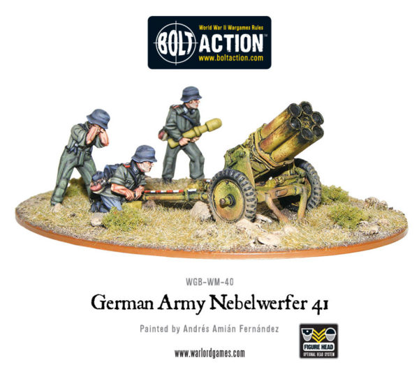Known to Allied troops as the Moaning Minnie, the Nebelwerfer emitted a terrifying shriek and a colossal smoke plume when fired. The psychological effect was almost as deadly as the detonation of the payload! Here we see our Nebelwerfer 41 with German Army crew as painted by Andres Amian Fernandez.