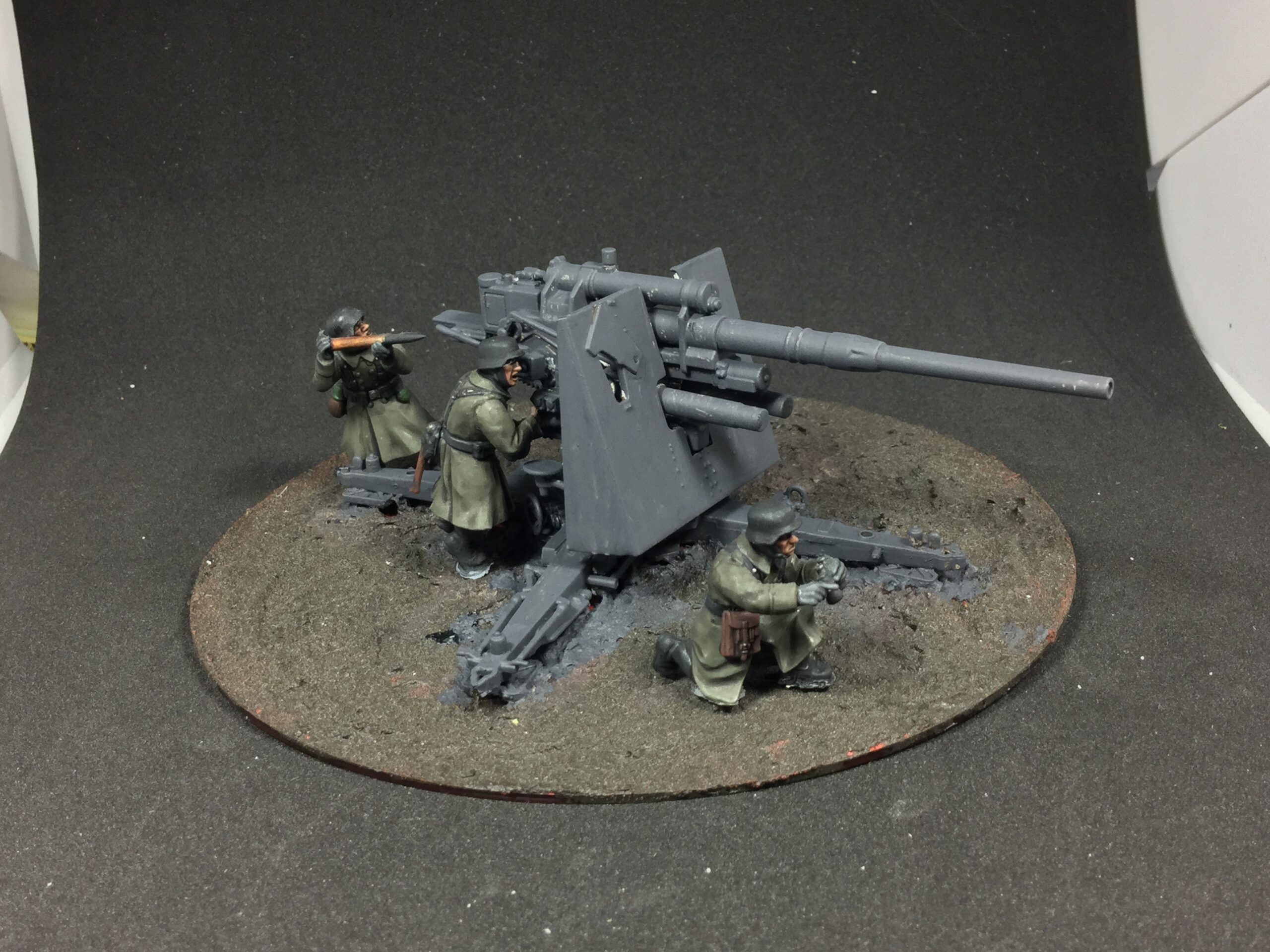 The MMG Team and the mortar team also used arms from the Soviet infantry, the design of the Coat is so similar there is hardly any difference. I had so much fun converting these Models, that I also started to build a crew for an Acht-Acht, here you can see a vital step of my painting process. I used a black wash over the whole model after I applied all the base colours. This gives a more “colder” finish to the final result than a brown wash, which I find more fitting for the winter theme.