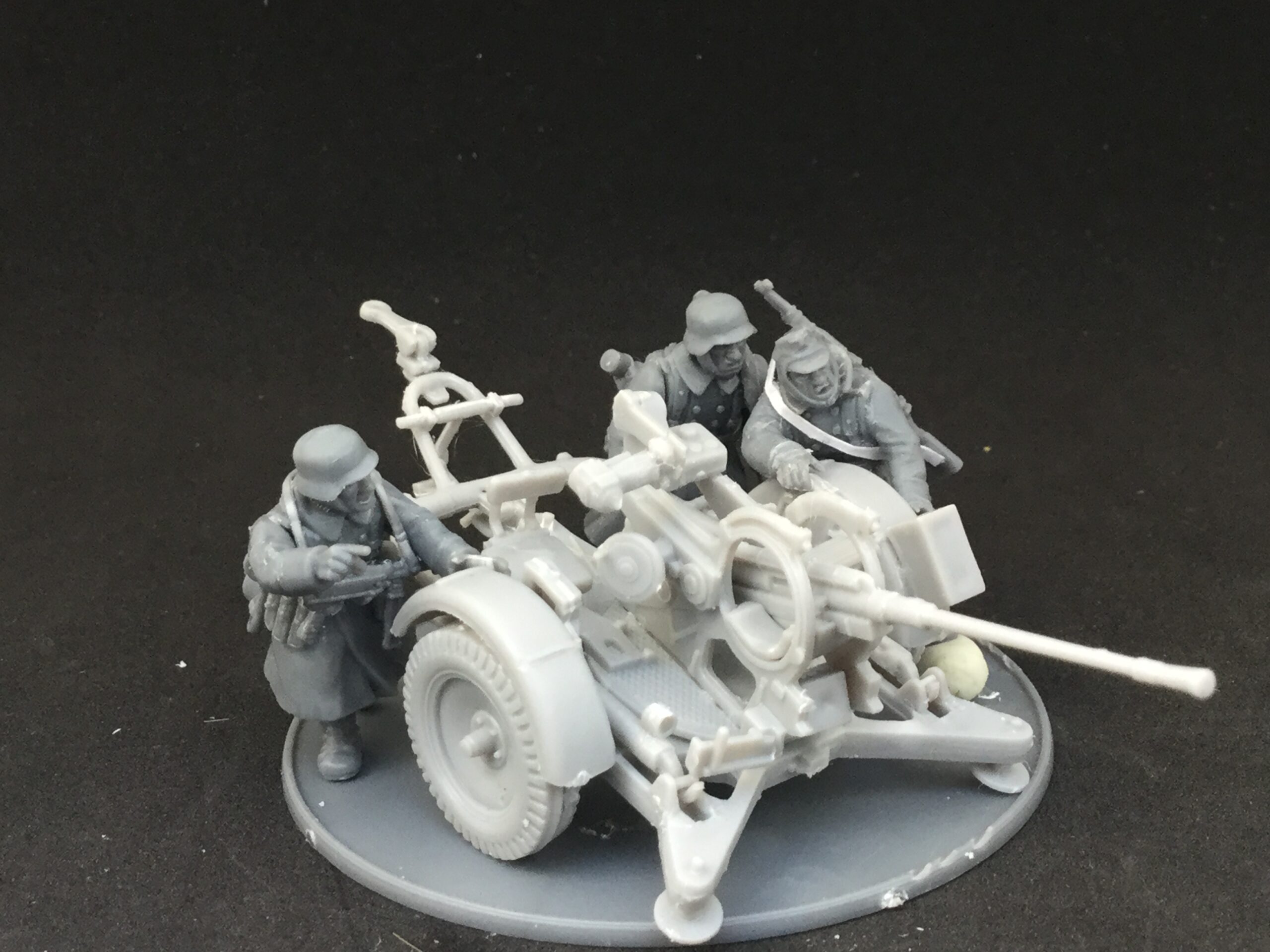 After finishing the minimum requirements for a Bolt Action Army (Officer and two squads) I came across a history podcast dealing specifically with the Wehrmacht in a city fight, and how their tactics developed. Two points struck out for me, the use of 2 cm AA guns to suppress snipers and the formation of storming parties armed with lots of SMGs and Flamethrowers. That’s two things I want to include in my army as well. I have already converted and painted a Flamethrower Team, that will be expanded into a third Infantry Squad festooned with captured Russian SMGs and Schmeissers. And 3 Guys pushing a limbered 2 cm around like in “saving private Ryan”, only in greatcoats, are way too cool to miss out. Yes, I know that I cannot have 2 artillery guns in one platoon, but remember what I said earlier. I want to paint it so I am going to paint it anyway.