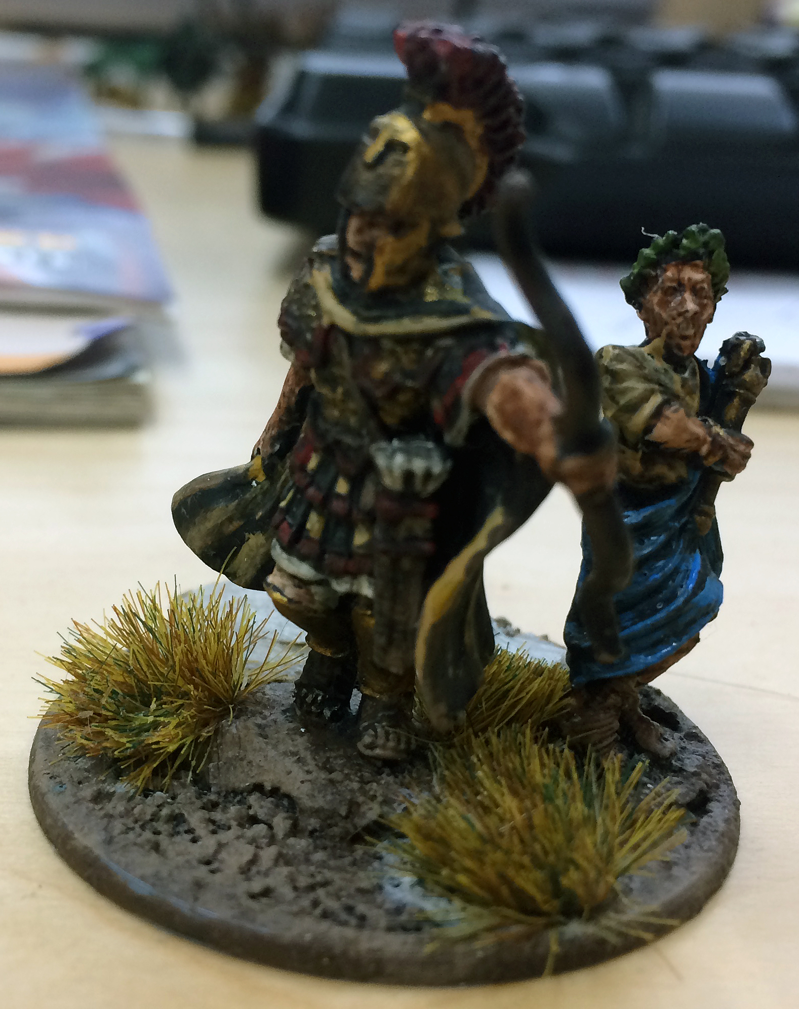 Using a round 40mm base, Tom positioned the now bow-armed Centurion in front of the cowering noble, imagining a bodyguard stepping in front of his master in the face of impending danger. This mini-diorama adds bags of quality to Tom’s Hail Caesar army and is simple to replicate.
