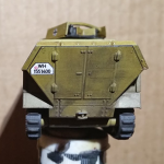 Next came the wheels and tracks – which I painted in a flat black, then I hit the entire model with a flat varnish. After it dried, I used a Burnt Sienna oil wash over the entire model. At this point I also glued the top of the chassis to the base of the chassis.
