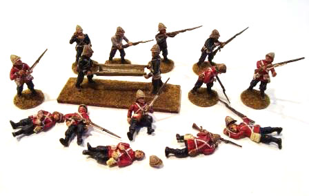 There is a classic scene in the movie Zulu where two corporals, Lyons and Allen, are wounded within moments of each other. After treatment by Surgeon Reynolds, they went around on their hands and knees giving out ammunition to soldiers at the barricades. I used the kneeling pose figures and added a sling to one figure to support his right arm while his outstretched left hand is handing out ammunition boxes. The other I removed the frock coat and webbing to represent the soldier in his shirt sleeves with a bandage on his arm.