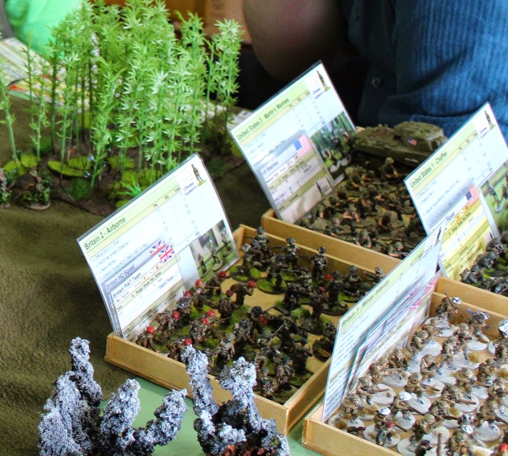 - Players Essential Tin: We created a tin containing all the order dice, other dice, dice bag and 2 army trays. This kept all the bits together. Each tray holds 600 points pretty well. The Army Cards were placed at the back of the tray and each army was put on show for players and spectators to examine.