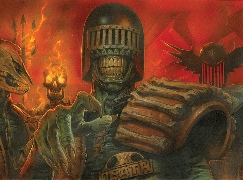 Aided by his fellow Dark Judges Fear, Fire and Mortis, Death wrought genocide upon what is now known as ‘Deadworld’. Not content with his work, he then used dimensional jump technology to reach Earth…