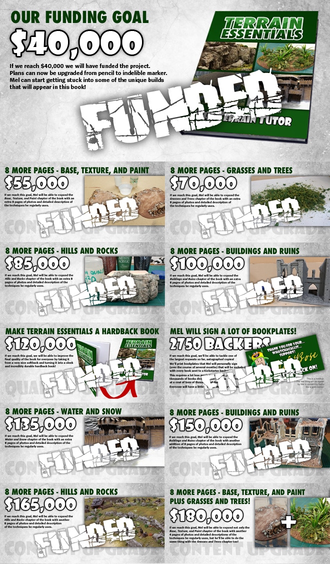 Dave & Mel are using this Kickstarter campaign to fund a printed version of the book – Terrain Essentials – a 96+ page book perfect to add to the collection of anyone with an interest in creating excellent tabletop terrain, regardless of purpose or the builder’s ability.