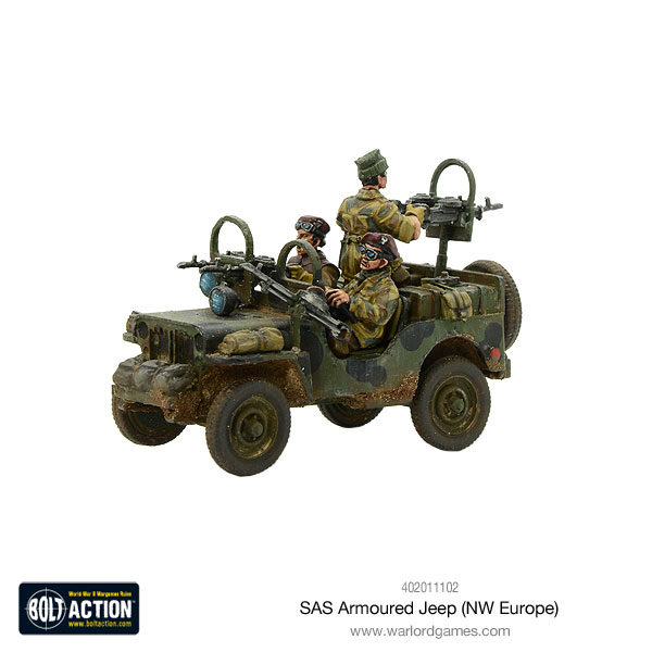 To represent these, you can use the warlord SAS jeeps and simply decide how many machine guns you want on your model since the amount ranges from just two Vickers K machine guns up to 0.50 cal. armed jeeps depending on what year you want to depict. In 1944 the SAS jeeps typically carried only the twin Vickers (use this new SAS jeep or use the airborne jeep model