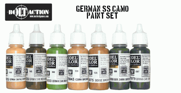 This paint set gives you the colours necessary to paint the main camouflage styles used by the Waffen-SS. For equipment, field grey tunics/trousers, etc you’ll need the Late War German Paint Set as seen above too