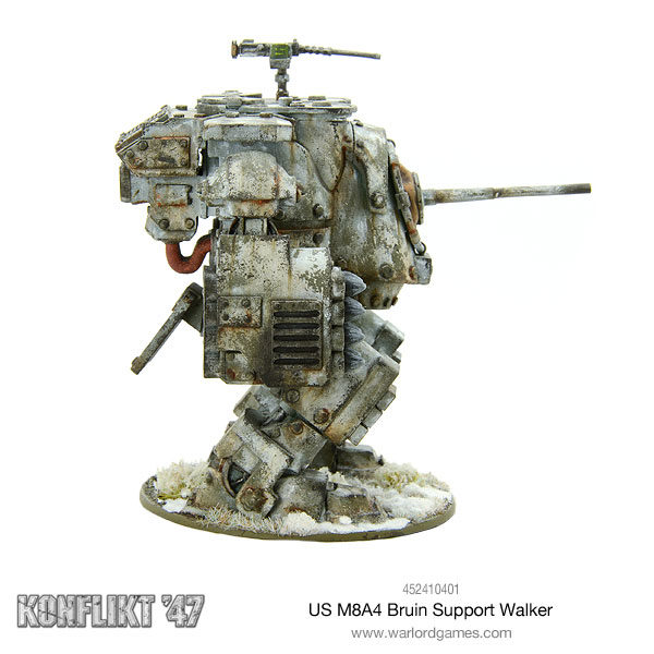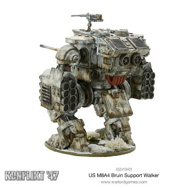 In response, the versatility of the Grizzly’s fists was sacrificed for heavy firepower in the form of heavy rocket racks. The Bruin retains the functional 75mm gun but its primary role is to crack bunkers, gun emplacements, and to blast apart heavy tanks with its rockets.