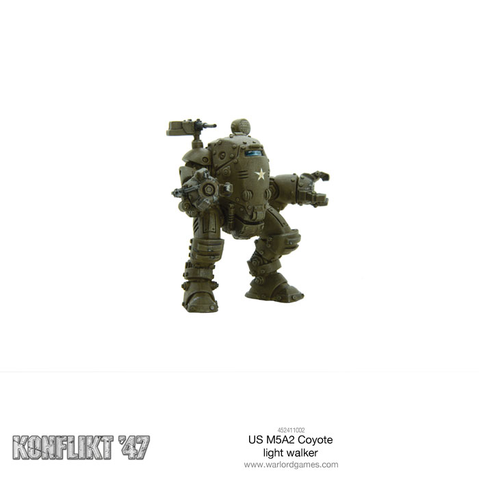 A breakthrough in the power of repulsor pods led to first the Jackal and then the Mudskipper walkers, built to keep up with fast moving jump infantry. The M5A5 Jackal sacrifices firepower for speed but the A6 version adds a flamethrower to compensate.