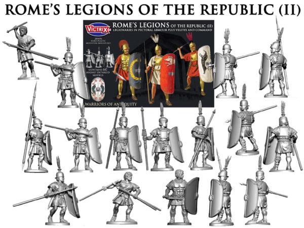 Contains 60 Republican Roman legionaries wearing square pectoral armour, and light infantry skirmishers.