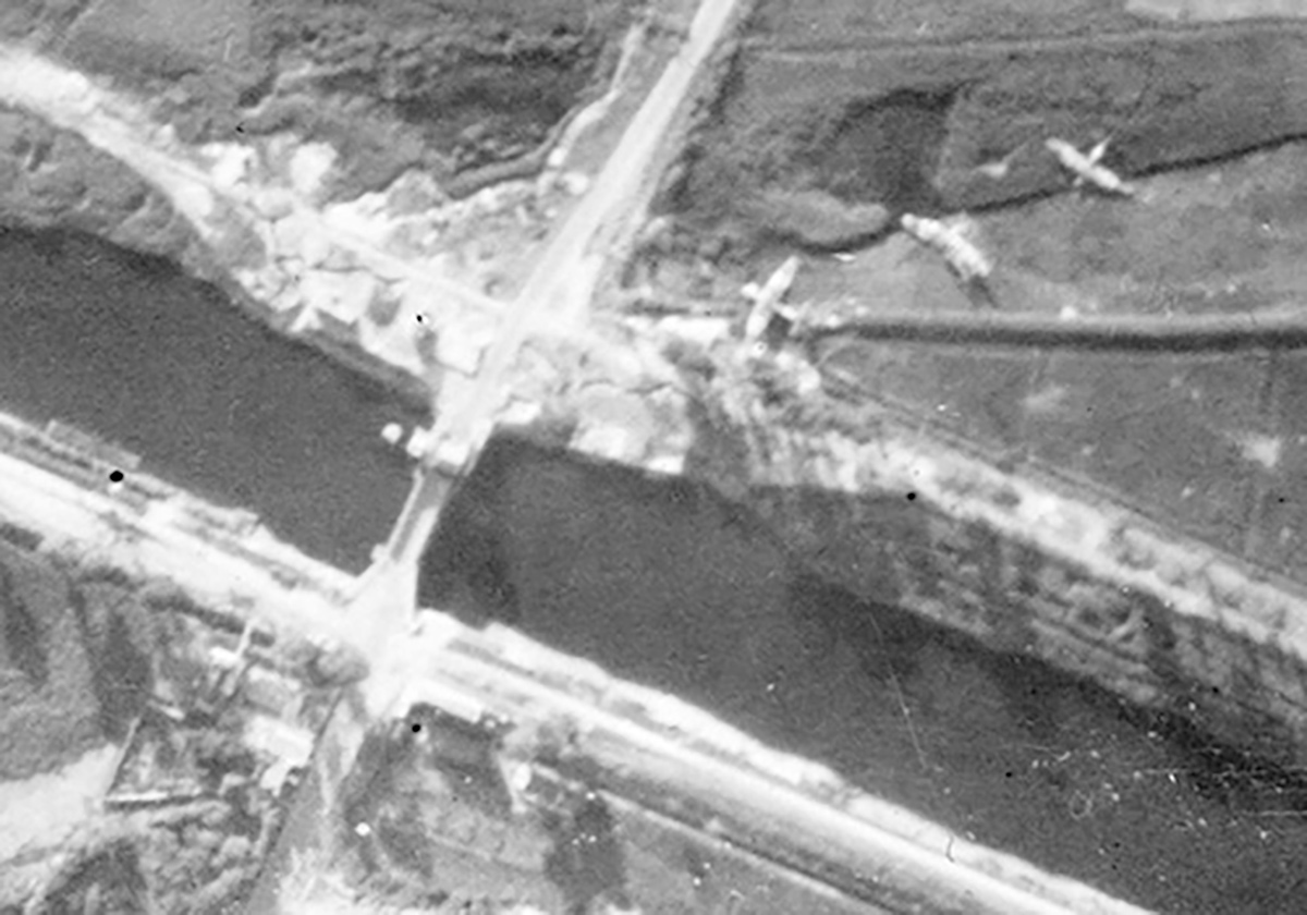 An aerial photograph taken by an RAF photo-reconnaissance unit, showing the gliders used in the assault on the Caen canal.