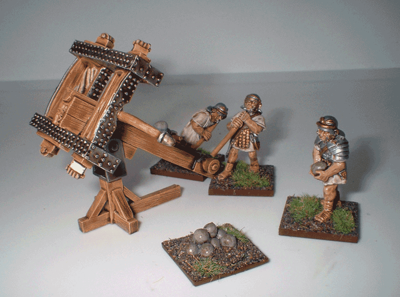 The war machine is served by 3 crew, all sculpted by the amazing Paul Hicks who has instilled in them great character, pulling and pushing to haul back the pulleys and launch their stone shot against the distant enemy.
