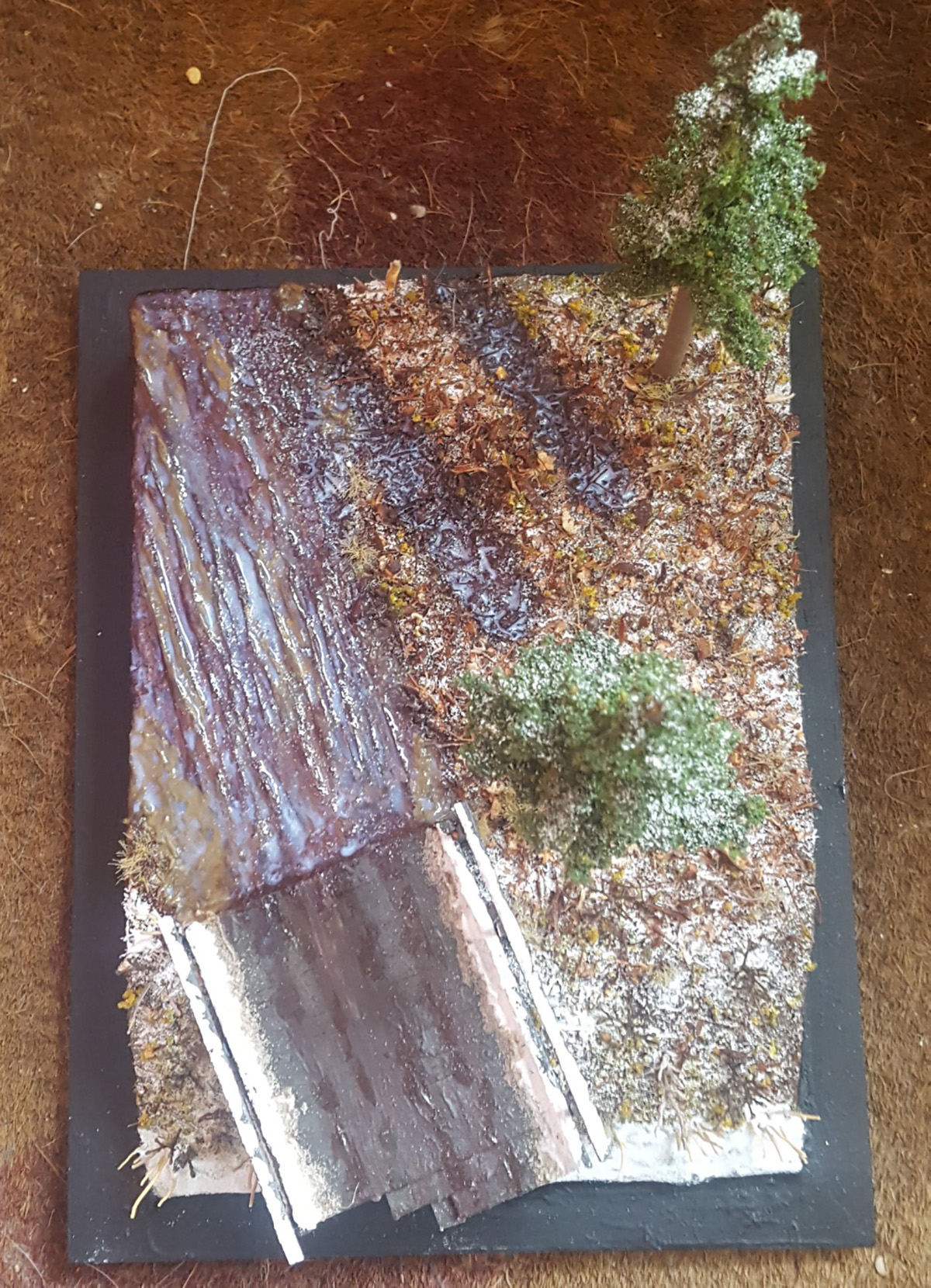“The trees are made out of chopsticks and some old plastic trees I had in my bits box. I cut the chopsticks to size and then glued bits of the plastic trees to the trunk and added some foliage and the snow effect.”