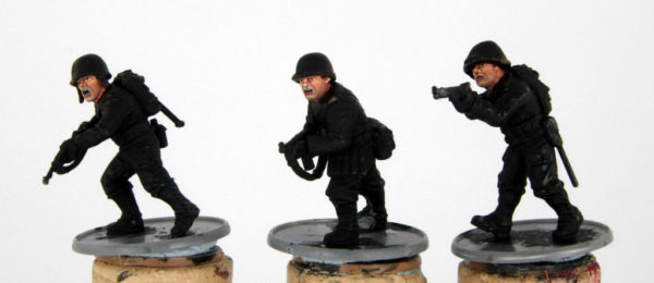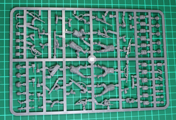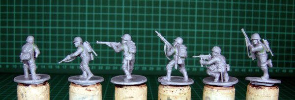 I decided to glue the figures to the included 25mm base straightaway, to limit the amount of handling and have more stability while attaching arms, weapons and equipment. I used ‘Revel Contacta plastic adhesive’ to glue all the parts together. They were then ready to be fixed onto corks with ‘Blu Tack’, there are other methods of handling a figure while painting but this is what I am used to and it works for me. I then used ‘Green Stuff’ to fill any slight imperfections or gaps in the body and equipment and as you can see, there was very little to do.