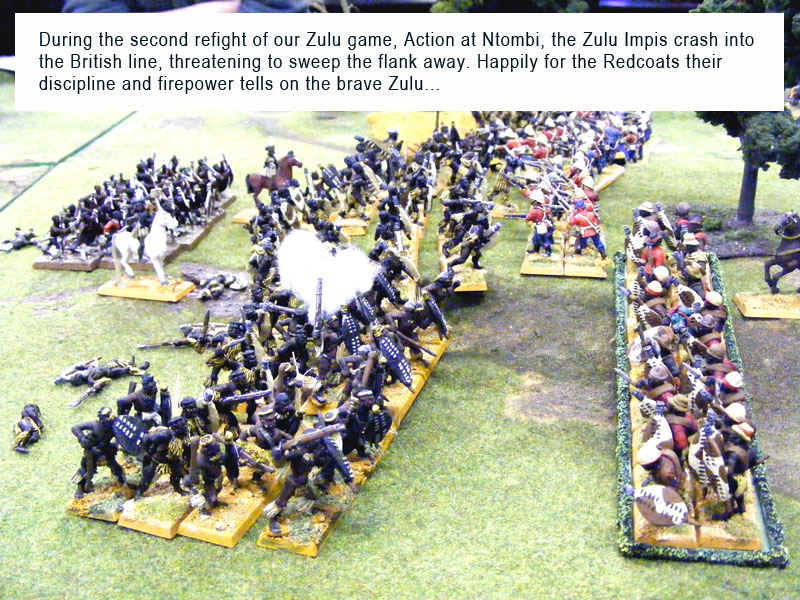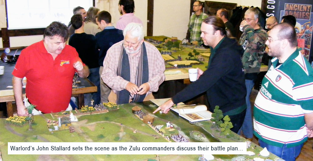 Clustered around a 10′ by 6′ table, Paul and John from Warlord fought out two Zulu war battles over the day, refighting the savage battle chronicled in the rulebook – Action at Ntombi.