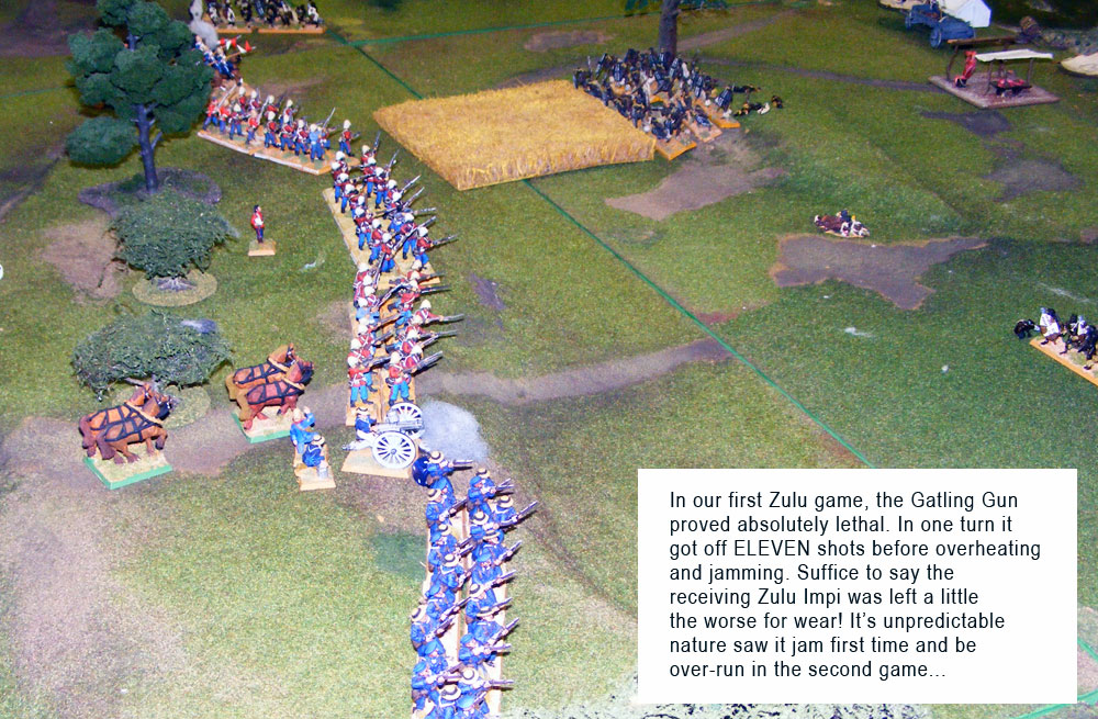 The first game saw the British fend off the Zulu horde thanks to some shockingly bad dice-rolling by Mike Blake. Other highlights were the Gatling gun getting eleven shots off in one turn before finally overheating and jamming, and Steve Jones’ masterly use of the Lancers to sweep aside two Impis with ease.