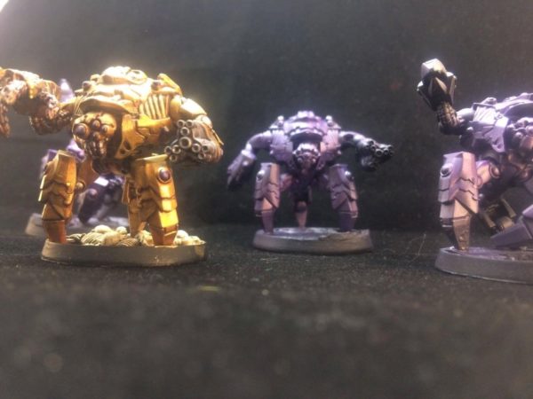 In terms of colour the only model I had a concrete idea for was Barduk Vul, an ostentatious bright gold Suit with Purple lighting, which in turn led me to look to Red, White or Purple as complementary colours to suit the gold, in the end, once Dan had showed me some metallic Purple paints, my mind was set and Purple became the Armour colour of my suits, and I extended it to the Outcasts as a spot colour, to better tie the force together.