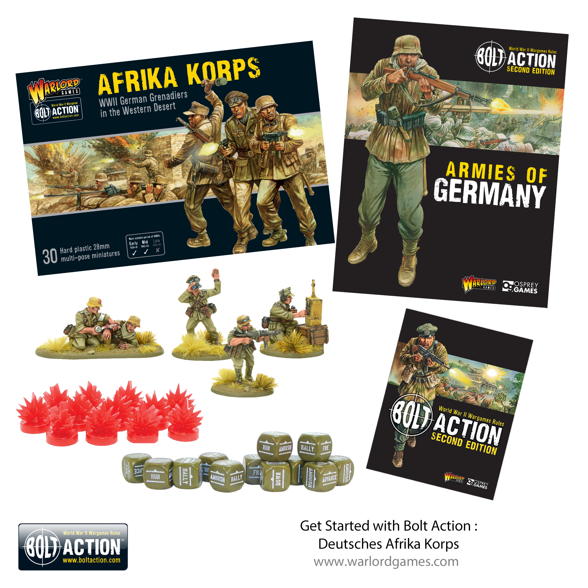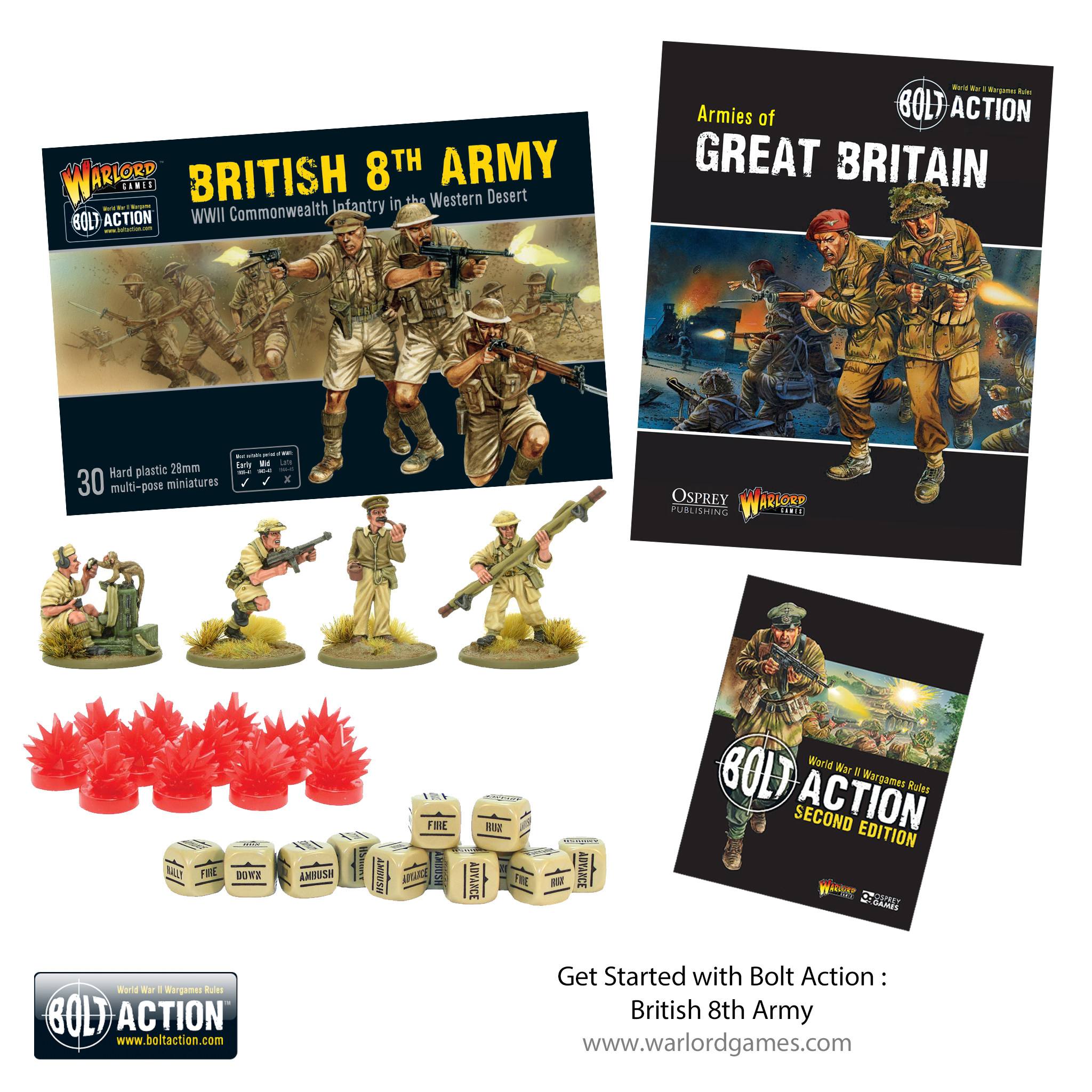 As well as setting you well on the way to a fantastic collection of miniatures, they include everything you need to play the game. Full rules are provided in the form of a free A5 Bolt Action rulebook and the ‘Armies of’ supplement, as well as gaming aids in the form of order dice and plastic pin markers.
