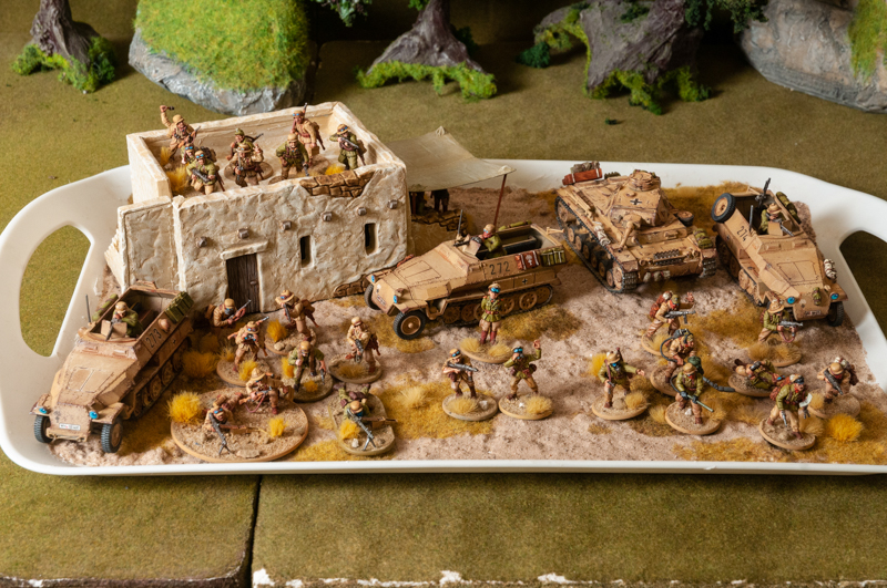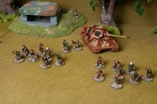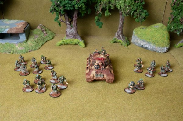 The guys in Southend threw an excellent weekend with a very friendly atmosphere. I’ve never been much for competitive gaming but everyone’s attitude and sportsmanship were excellent and I had a blast, even managing to win a game. I was a little pushed for time getting an army together, having no complete Axis forces in my collection yet. To that end, I wrote a list with as few models as possible. At 4 dice and 18 models, this was the stupidest 1000 points army I’ve ever tried to play.