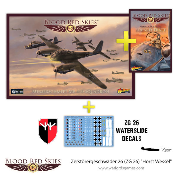 Featuring the German ACE Eduard Tratt and decals for Zerstörergeschwader 26 (ZG 26) “Horst Wessel”, a Luftwaffe heavy/destroyer Fighter Aircraft-wing, the Luftwaffe receive the latest twin-engined Me 410…